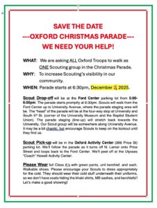 Please see the message from Jason Bouldin below about marching in the Oxford Christmas Parade. Please let your scouts know about this. We need to remind the community that Scouting is alive and well in Oxford! Thanks to Jason for organizing this. His contact information is below if you have any questions.