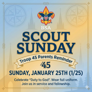 – The Troop will be attending the 10:00am worship service and afterward serving the congregation chili and fixin’s in the Fellowship Hall. – Scouts should be at the church at 9:00am (Scoutroom basement). We’ll assemble outside of the sanctuary at 9:45am to process in and sit all together in a reserved seating area. – Scouts will be cut loose as soon as we clean up after the lunch ~12:30pm or a little after. – Scouts should wear FULL class A’s: kaki shirt, green pants, belt, kerchief and slide. – Scouts will receive 2 service hours credit. – Scouts will receive a BSA Scout Sunday patch!